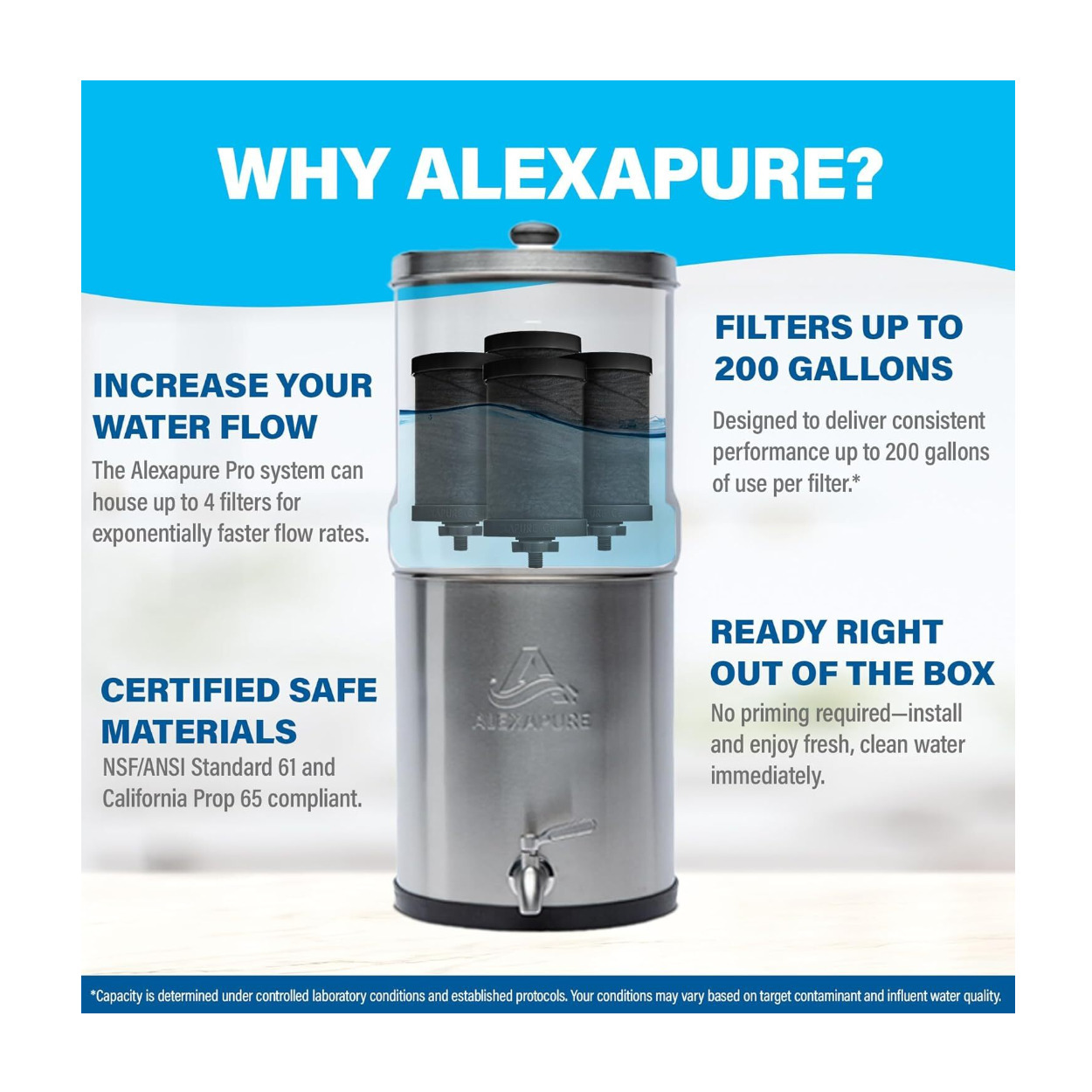 Once you taste the water that the Alexapure Pro Water Filtration System provides, your worries will wash away. For safer, cleaner water that tastes better, you can trust authentic Alexapure products. The Alexapure Pro Water Filtration System can accommodate up to four filters. When more filters are added, the water flow rate increases without sacrificing water quality.