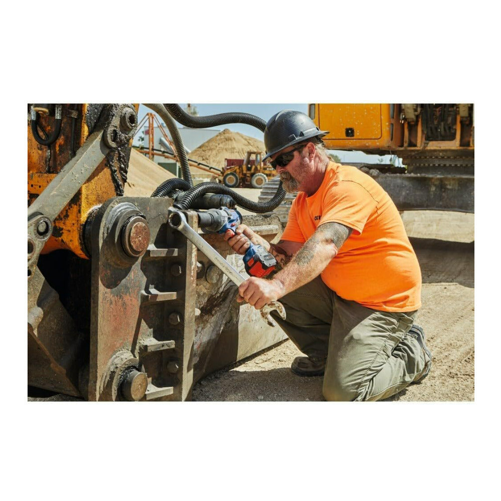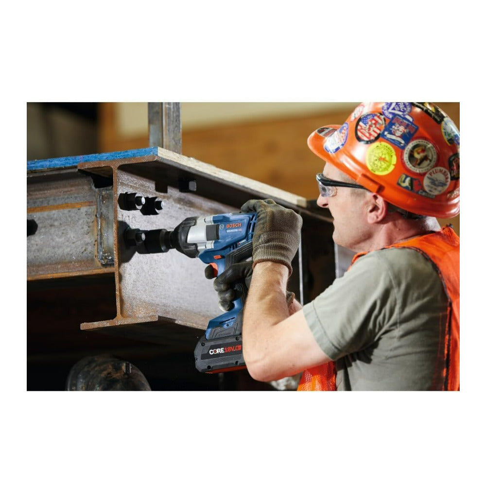 The Bosch PROFACTOR GDS18V-770 18V 3/4 Inch Impact Wrench with Friction Ring and Thru-Hole is designed for breaking free and driving large bolts, nuts, and anchors quickly. The ergonomically designed grip features a soft grip for comfort and better handling. It is part of the PROFACTOR System, which pairs BITURBO Brushless Technology with a CORE18V High Power Battery.