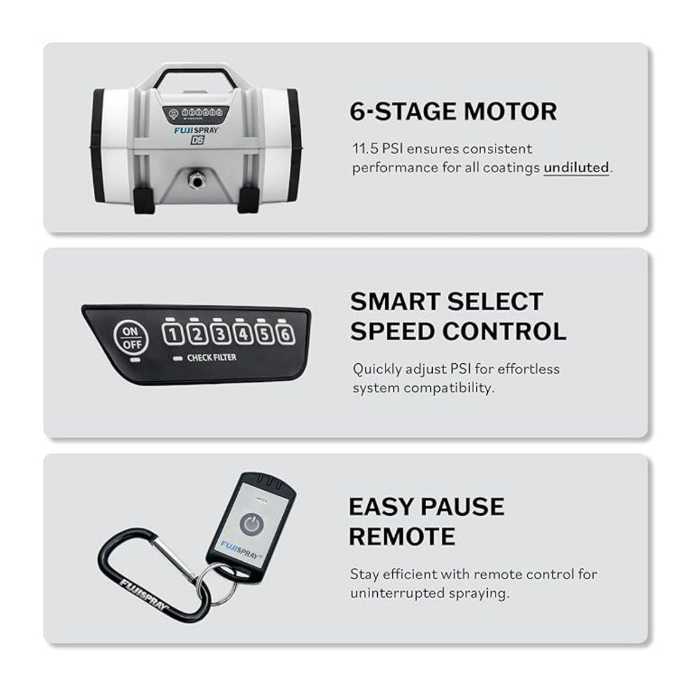 The Fuji Spray D6 6-Stage HVLP Turbine Sprayer in Gray with the G-XPC HVLP Spray System sets a new benchmark in the spray finishing industry, offering a powerful 6-stage motor classified at 11.5 PSI, engineered for efficient and cooler operation to prolong motor life, and maximize return on investment. With 6 pre-set pressure settings, users gain precise control over spray output, ensuring professional-grade results with minimal overspray and waste. Providing consistently warm dry air, the D6 atomizes even the highest viscosity coatings with virtually no thinning required, achieving stunning finishes and even coverage. The D6 system is designed and assembled in North America, built with a rugged design to ensure unmatched longevity whether being used in the workshop or at the job site. The Turbine Smart Select Control Panel with Easy Pause Remote Control operate from up to 110 feet distance. The G-XPC spray system comes with a 400cc aluminum cup, standard 1.4 mm air cap, adjustable side-mounted Fan Pattern Control, Stay Cool Handle, and a Swivel N’ Set cup feature for spraying at any angle easily.