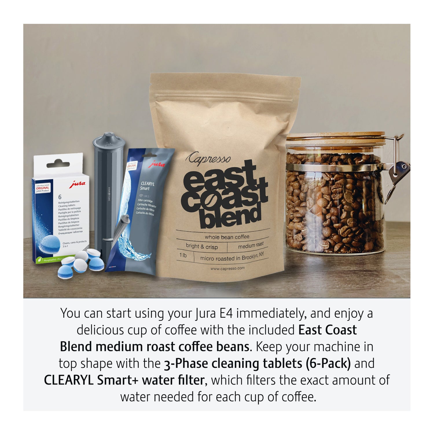 It is bundled with the Jura CLEARYL Smart+ Filter Cartridge Water Stabilizer with RFID Technology and TÜV-Certified Hygiene and Jura 3-Phase 6 Cleaning Tablets, making sure you can maintain your E4 with ease. Also easily enjoy a medium-roasted coffee that is bright and crisp with a smooth, balanced flavor right as it arrives with the included Capresso East Coast Blend Whole Bean Coffee.