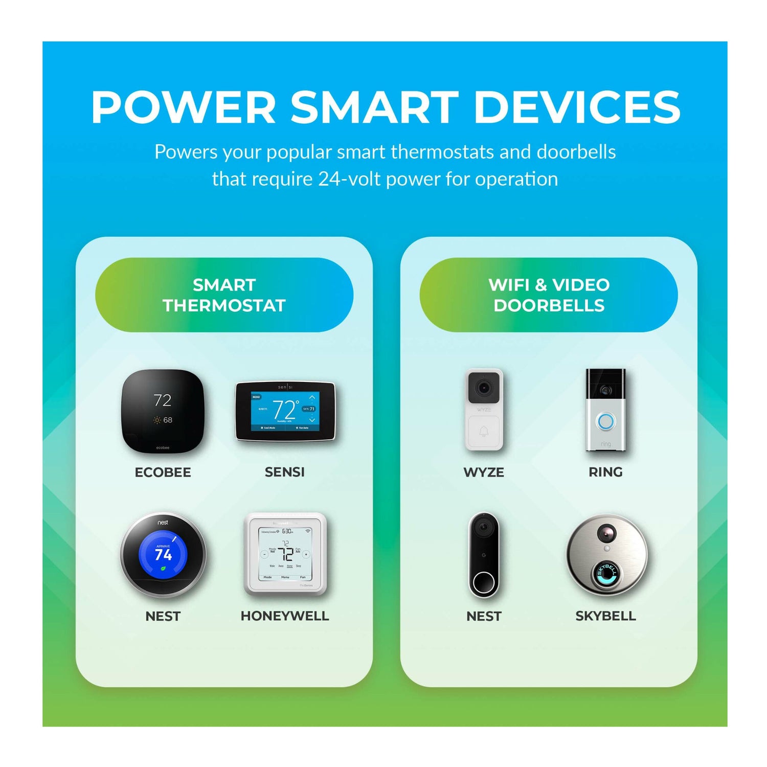 Our 24-Volt transformer and C-wire adapter plugs into your standard 110-Volt/120-Volt outlet and converts to 24-Volt AC.