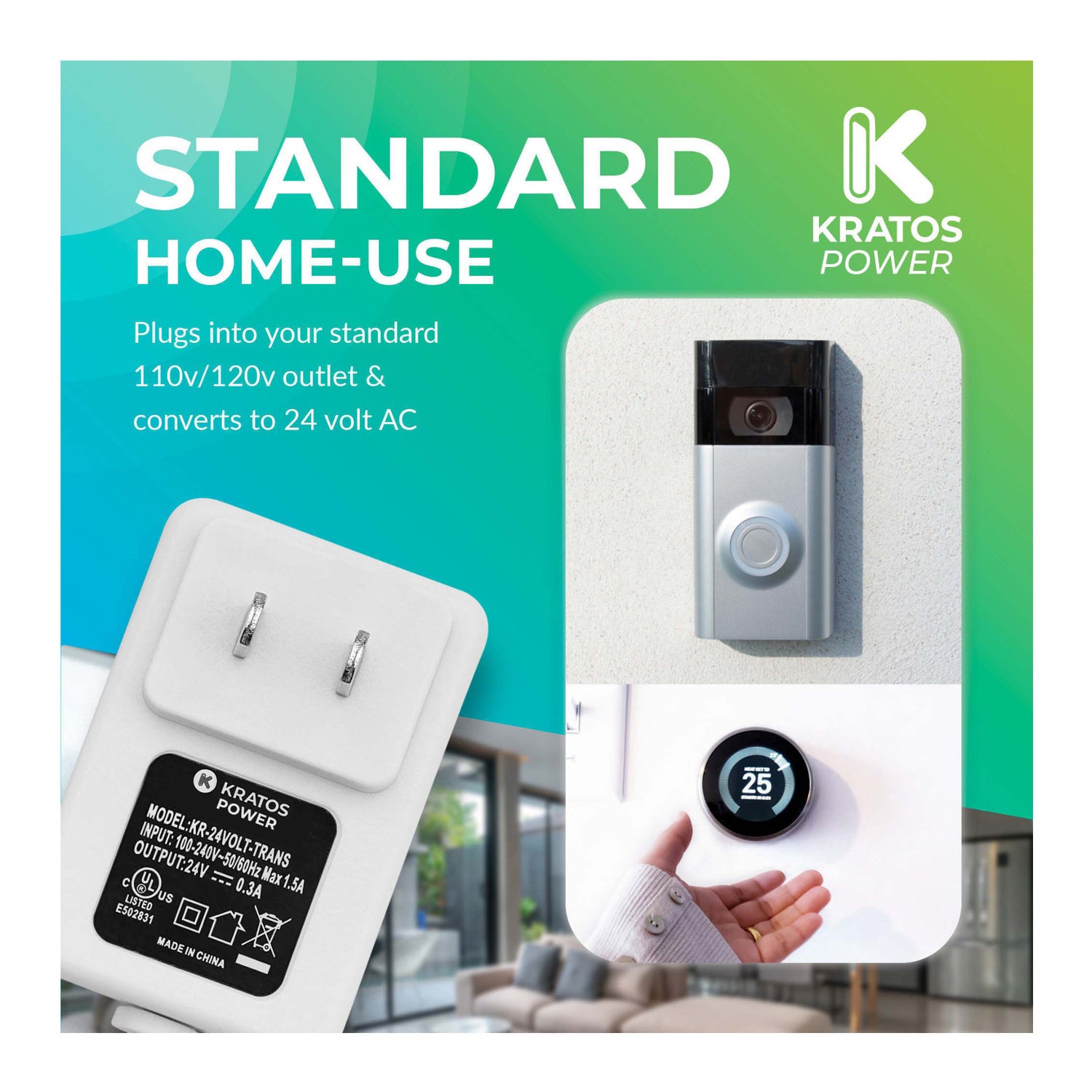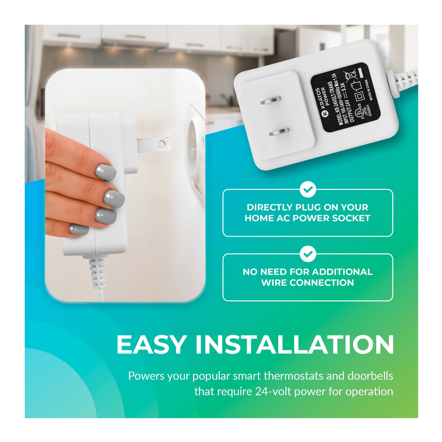 The Kratos Power UL-Certified 24-Volt Transformer and C-Wire Adapter offers a no-frills powering solution to your wifi intelligent thermostats from any standard 110-Volt/120-Volt electrical outlet. This adapter delivers the constant 24-Volt power required by today's top wifi Smart Thermostats. In addition, it's safe to use. It will protect your wifi Smart Thermostats from over-voltage, short-circuit input, and over-current output.