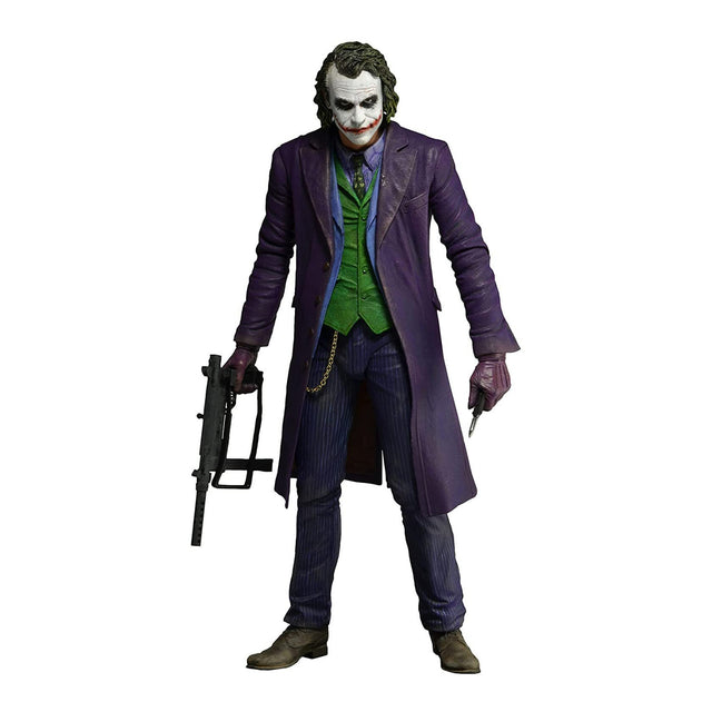 The NECA The Dark Knight Joker 1/4 Scale Action Figure is an 18-inch tall figure based on Heath Ledger's haunting portrayal of the Joker in Christopher Nolan's Dark Knight Trilogy. The Joker features incredible lifelike detail, interchangeable hands, and accessories which include a knife, pistol, and machine gun.