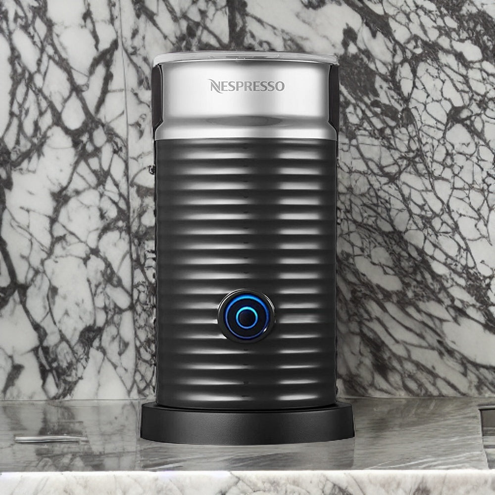 The Nespresso Aeroccino 3 Milk Frother offers three styles of preparation with a single touch button. The Aeroccino 3 brings back the retro look of the Nespresso Aeroccinos. This milk frother makes hot milk foam, hot milk, or cold froth, to help you prepare your favorite coffee beverage recipes at home in a simple way. It comes in a classic black finish.
