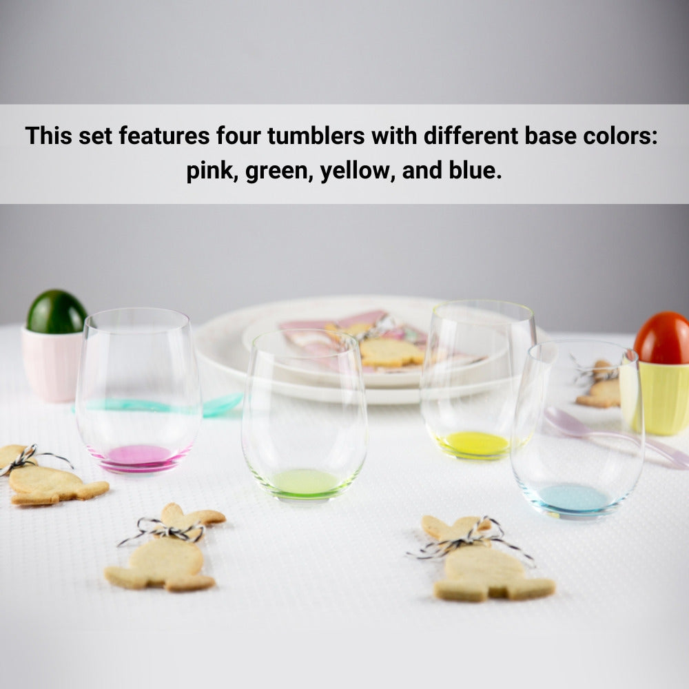 This set contains 4 pieces O Wine Tumbler Happy O in four cheerful springtime colors: pink, green, yellow and blue. The handy machine-made soft drink glass of the space-saving glass collection O Wine Tumbler spreads a good mood with its stemless design and the colorful base. The innovative design makes it less susceptible to glass breakage and easy to put into the dishwasher. O is the ideal glass for everyday use and for every occasion. It is fun, feels good to hold, looks trendy and it works! All Riedel glasses are dishwasher safe.