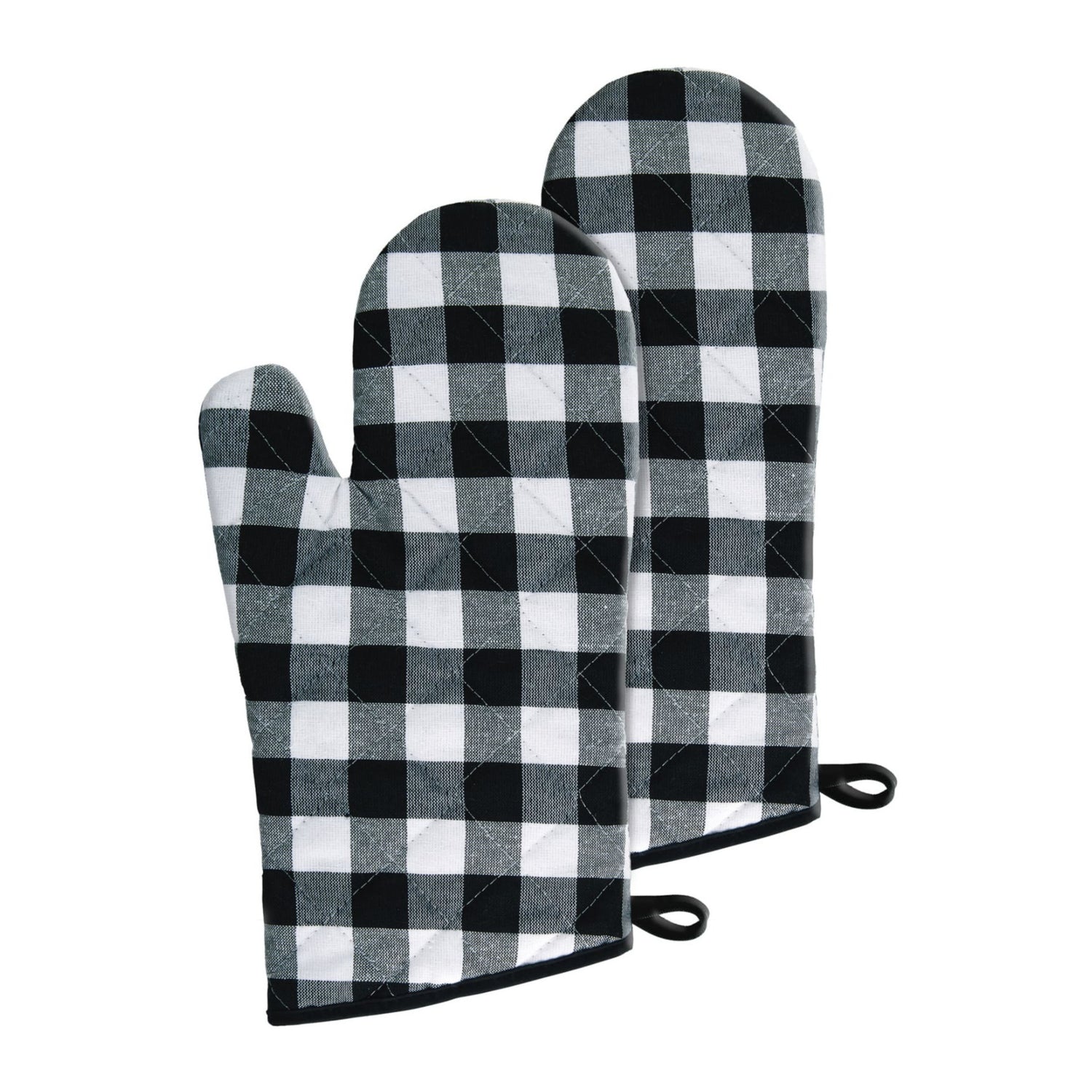 The classic buffalo check pattern comes to life on the Buffalo Check Oven Mitts. They are both fashionable and practical for everyday use in the kitchen. These mitts have a convenient loop for hanging. They are heat resistant, stain repellant, machine washable, and come in a set of 2.